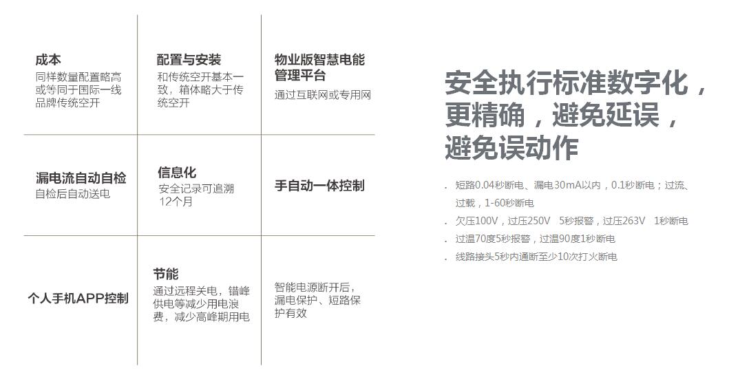 1.独有的智能断路云控电技术:产品内置可靠性更强的断路器控电装置和智能性更强的数字化控制芯片,真正意义上实现智能断路控电功能,不仅可精准、快速地实现用电云管理,而且可以实现在数字芯片关闭状态下,智能断路器依旧可以保留短路保护、漏电保护等用电保护功能。